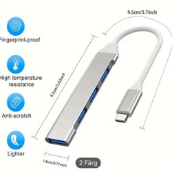 USB-hubb med en USB 3.0-port och tre USB 2.0-portar. För dataöverföring.
