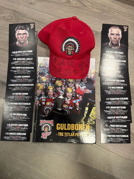 Samling av Frölunda Indians memorabilia. Inkluderar en signerad keps, guldboken och signerade spelarkort.