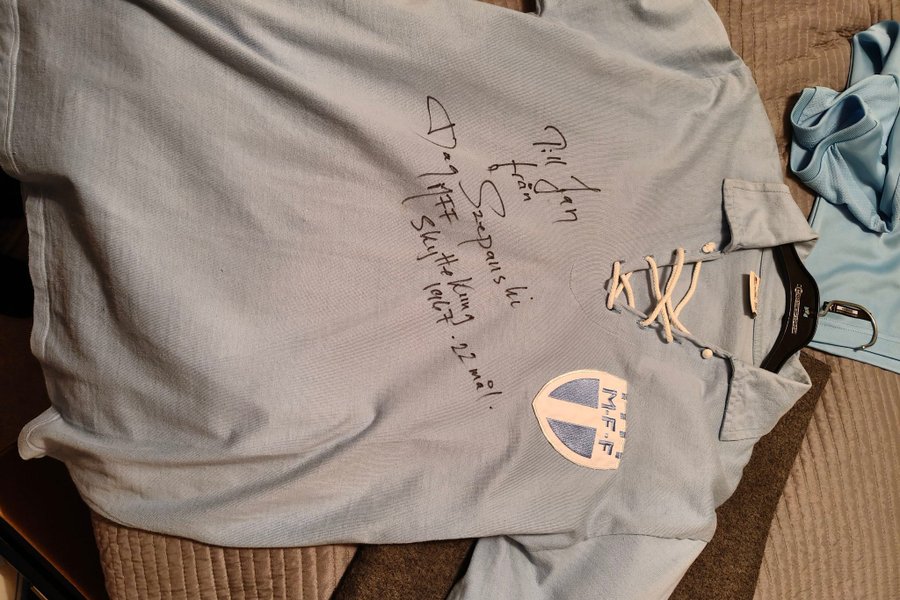 Ljusblå tröja med snörning i halsen och ett broderat märke med texten "M.F.F." på bröstet. Tröjan har en handskriven text som lyder "Till Jan från Szepanski Dan IFF Skytte Kung 1967. 22 mål.".