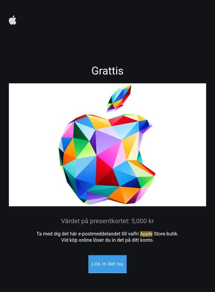 Presentkort på 5000 kr på Apple Store. Kan användas i butik eller lösas in online på ditt konto.