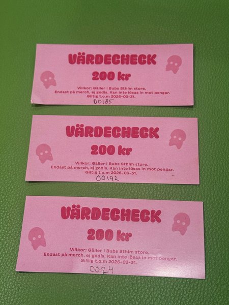Säljer tre värdecheckar på 200kr/st, så totalt värde 600kr, att handla merch för på BUBS butiken i Sthlm. Giltiga till sista mars. Passa på att inhandla någon snygg keps, hatt, mössa, tröja eller tshirt.