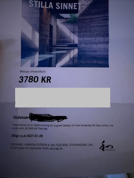 Presentkort på 3780kr på underbara Yasuragi som vi tyvärr inte hinner använda.. Går att använda till övernattning, spa, i restaurangen eller butiken :D