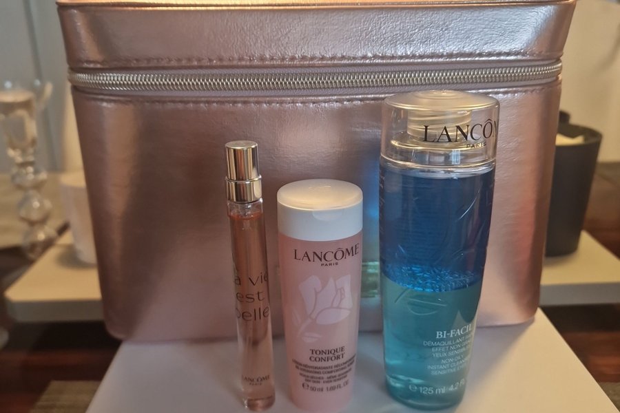 Lancôme set innehåller en sminkväska, La Vie Est Belle parfym, Tonique Confort och Bi-Facil sminkborttagning.