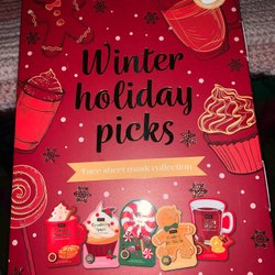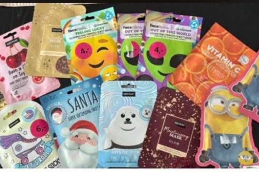 Parti med olika ansiktsmasker och fotmasker. Innehåller bland annat sheet masks med motiv som emoji, alien, Minion, tomte och säl. Även masker med C-vitamin och "Glow".