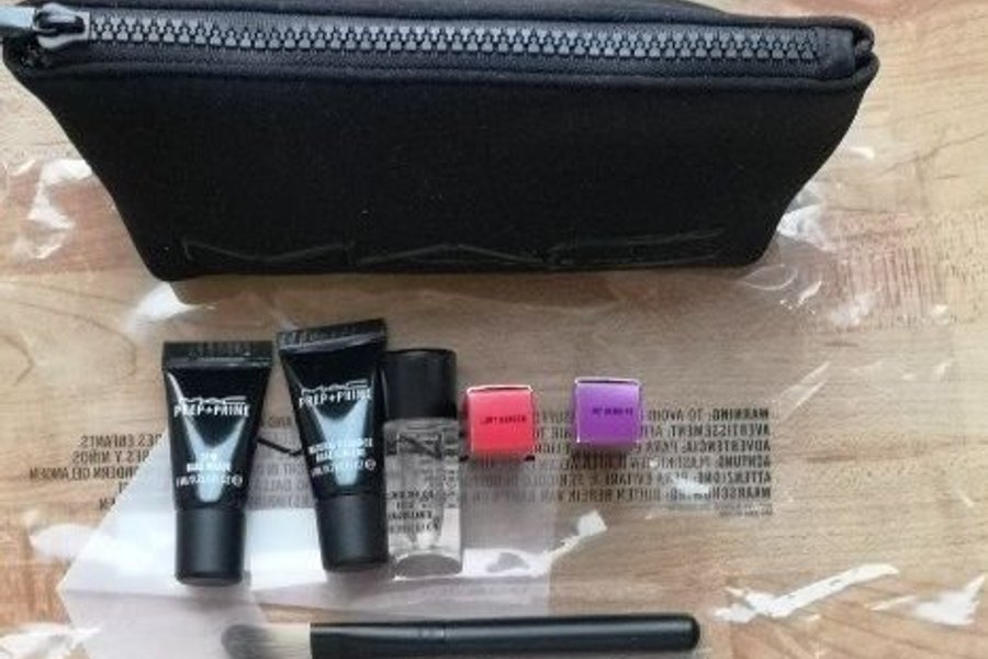 Sminksortiment i necessär. Innehåller: två Prep + Prime-krämer, 2 parfym och en borste.