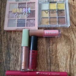 Erbjuder en blandad sminkkollektion. Inkluderar ögonskuggspalett från Sunkissed Crystal Crush, läppglans, och hårklämmor. Paletten aningen använd enligt bild.