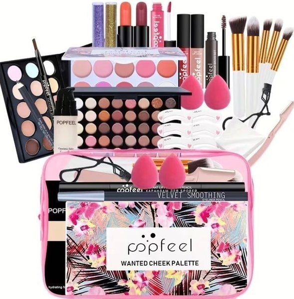 Extensive makeup set with eyeshadows, lipsticks, makeup brushes, eyeliner, eyebrow pencil, makeup sponges, eyelash curlers and face palette.
