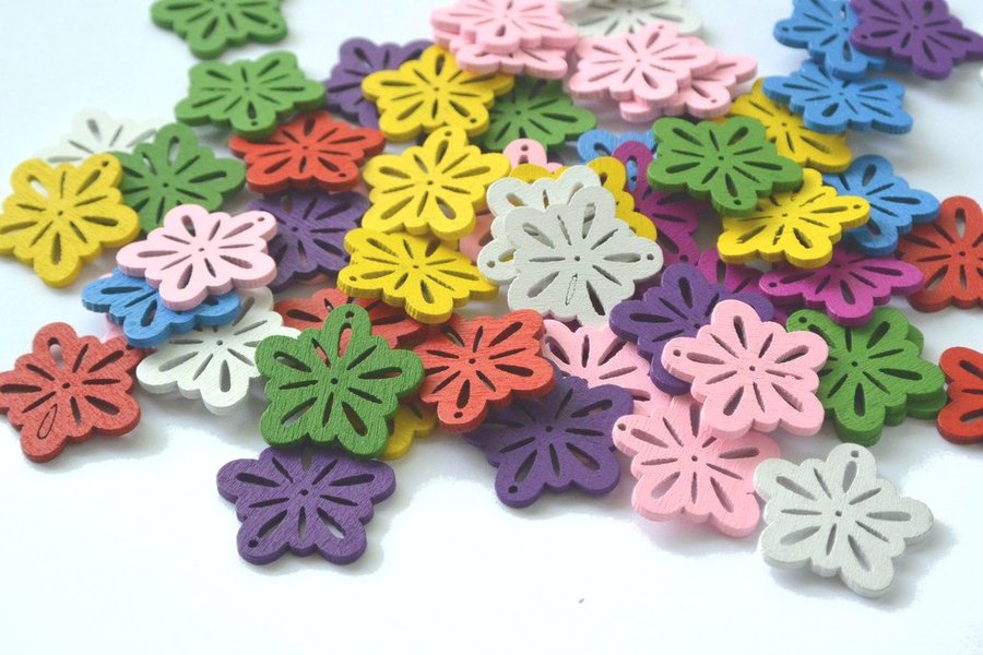 Träberlocker i mixade färger, ca 23x24mm. Förp. med 10 st