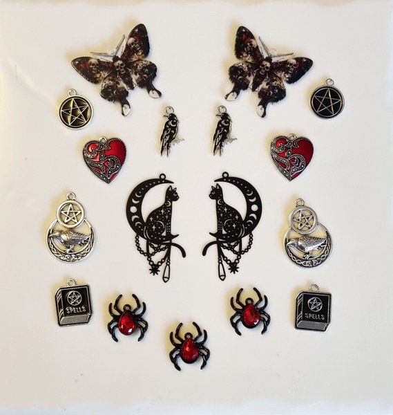 17st blandad gotisk/goth/got berlocker i olika former som ingår fjäril med dödskallar mönstret, korp, spindel med röda stenar, hjärtan, månen med korp.