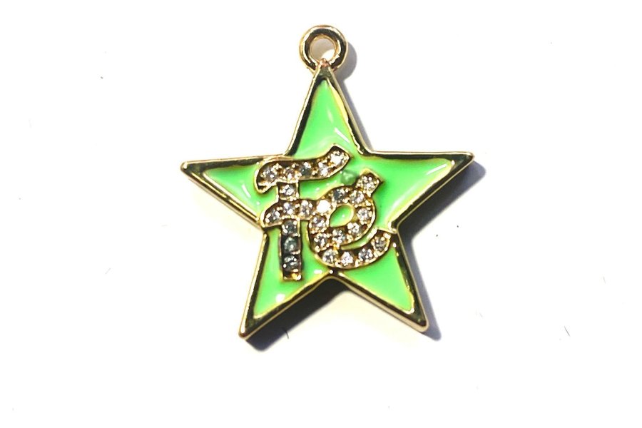 2st berlocker stjärnor som är long lasting pläderade i 18k guld och är i lime grön med bokstäver som ör fyllda med små strass stenar av cubic zirkonia
