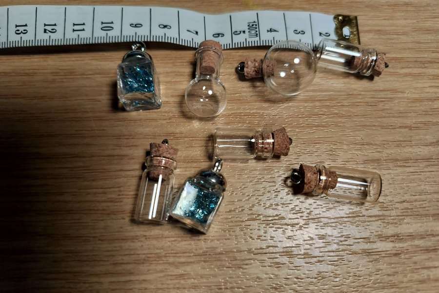 flaskor med kork som går att ta ur, dom med blått glitter i där sitter korken fast smyckestillverkning mm, berlock, dom som syns på bild är dom dom ingår dom är i glas