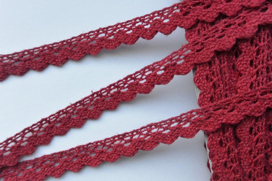 Spets av bomull, vinröd, bredd 12 mm.