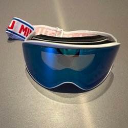 Skidglasögon från Bula. Glasögonen har en blåtonad lins och en vit ram med blå detaljer. Resårbandet är grått med ett mönster.