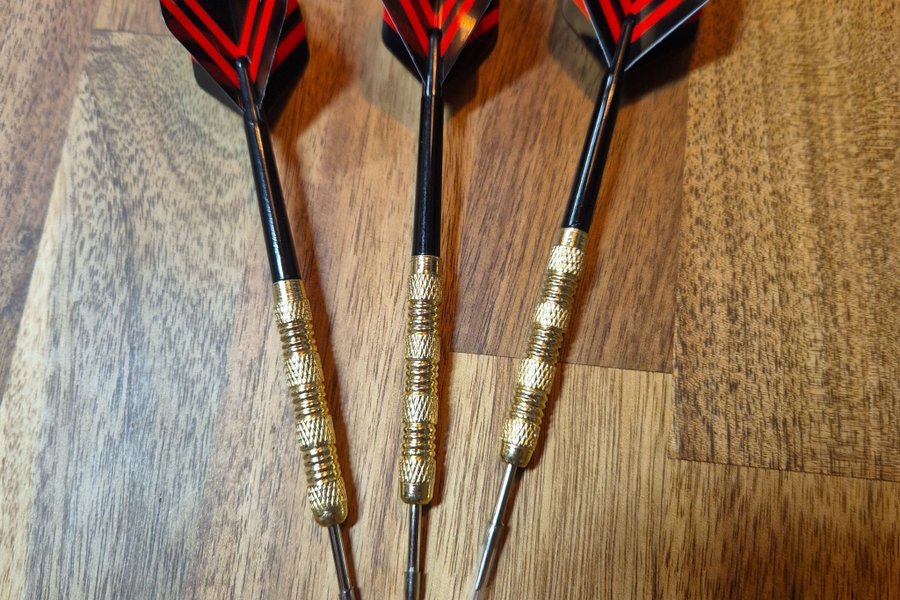 Tre dartpilar med svarta vingar och röda detaljer. Pilarna har ett guldfärgat grepp.