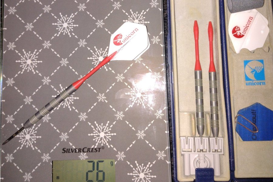 Ett dartset från Unicorn. Setet innehåller pilar, flights, spetsar och ett slipverktyg. En pil väger 26 gram.