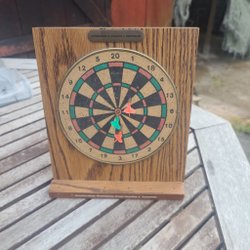 Darttavla med dubbelsidig design. Ena sidan har en traditionell dartlayout med numrerade segment, medan den andra sidan har en måltavla med koncentriska cirklar och poäng. Perfekt för både nybörjare och erfarna spelare.
