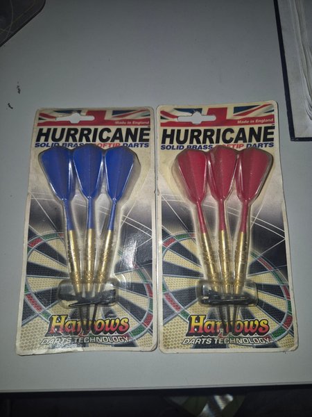 Två förpackningar med Harrows Hurricane Solid Brass Softip Darts. Varje förpackning innehåller tre pilar. Tillverkade i England.