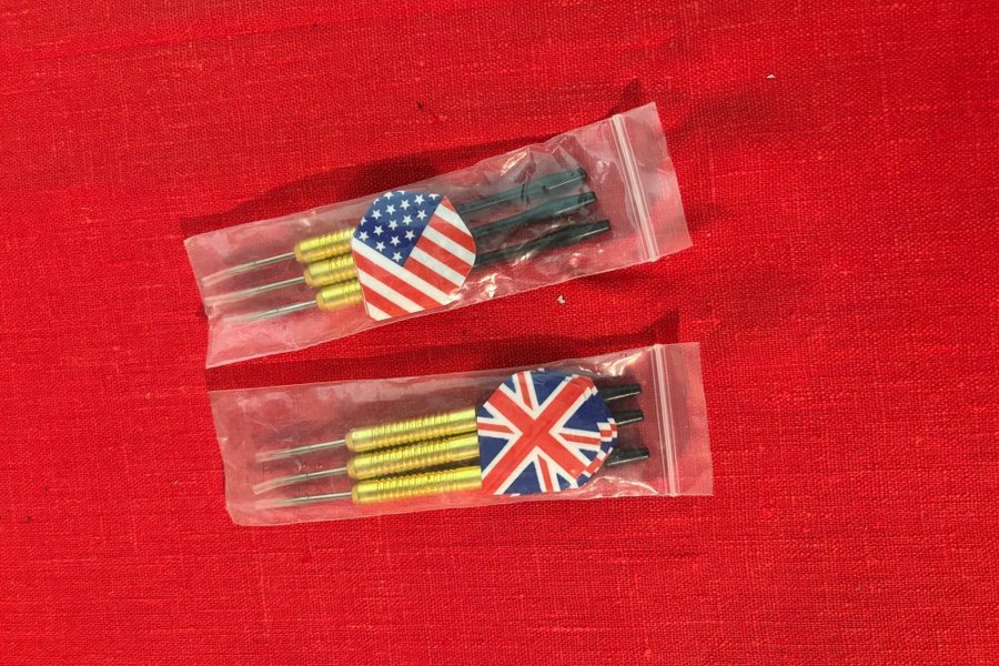Två set dartpilar, ett med USA-tema och ett med Storbritannien-tema. Varje set innehåller tre pilar.