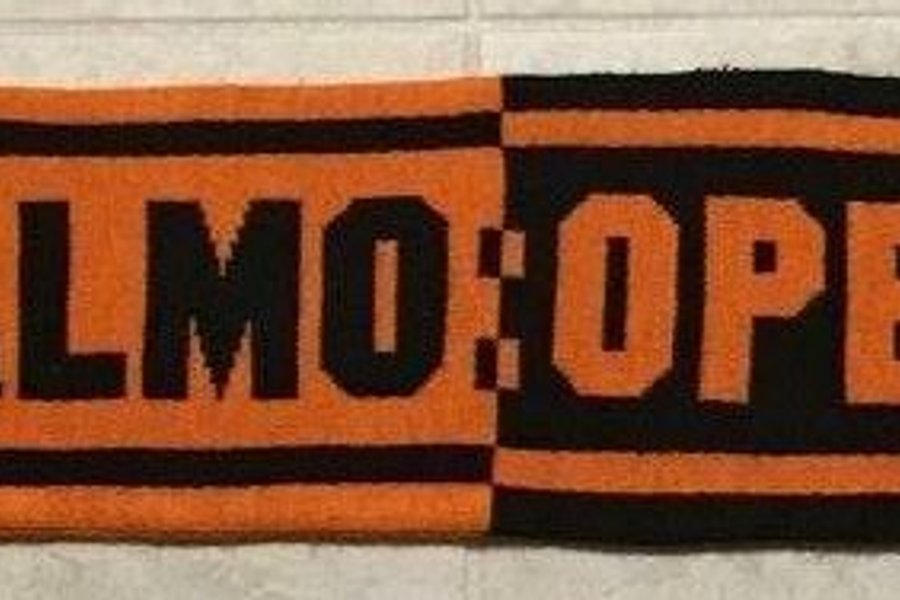 En halsduk med texten ”MALMÖ OPEN” i svart och orange färger. Perfekt för sportevenemang eller som en snygg accessoar.