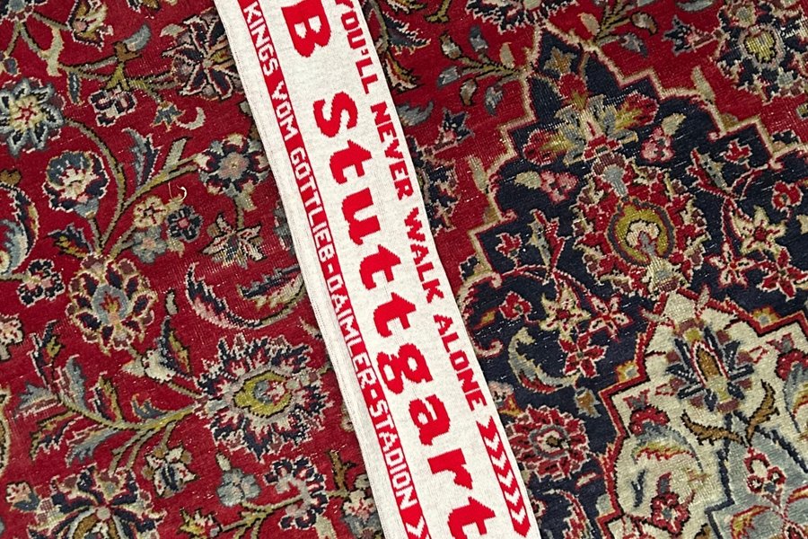 Halsduk från VfB Stuttgart. Texten ”YOU'LL NEVER WALK ALONE” och ”DIE KINGS VOM GOTTLIEB-DAIMLER-STADION” finns på halsduken.