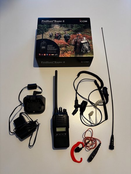 ICOM ProHunt jaktradio. Utrustningen inkluderar en radio, laddare och flera tillbehör.
