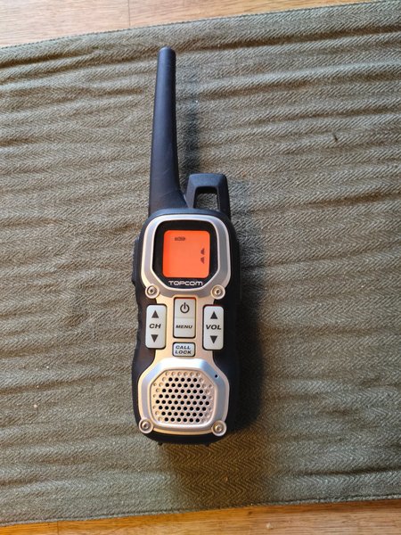 Walkie talkie från Topcom. Enheten har knappar för kanal (CH), meny (MENU), volym (VOL) och samtalslås (CALL LOCK). Displayen visar batteristatus och andra ikoner.