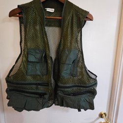Grön väst med flera fickor framtill och justerbara remmar baktill. Västen har en dragkedja fram och en pistolhållare.Mycket bra skick aldrig använd. Stl XL