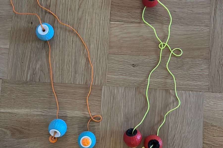 Två jonglerbollar Astrojax Den ena är blå och orange, den andra är röd och gul.