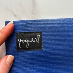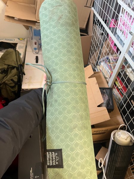 Yogamatta i ljusgrön färg med ett mönster. Mattan har en bärrem för enkel transport. En liten etikett med texten "positive mind, positive vibes, positive life" är fäst vid mattan.
