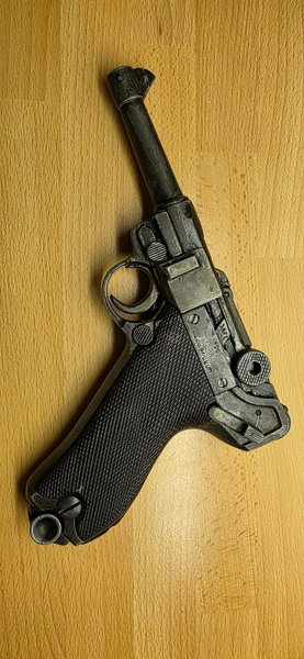 Luger P08 replika i metall och plast. Denna modell är en detaljerad kopia av den klassiker, med en svart räfflad grepplatta och tydliga markeringar som "P-08" på sidan. Replikan har en robust konstruktion.