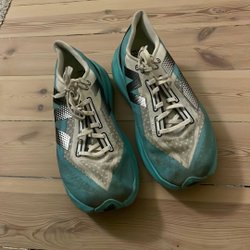 Saucony löparsko, storlek 39, deras endorphin serie med ”speedroll technology” modell 2 tror jag efter efterforskning på nätet. Storlek 39 men jag skulle säga att den passar om man vanligtvis har runt 38-38.5 i skostorlek så lite mindre i storleken. Färgen är ljusblå/gröna med inslag av vitt, svart och gult. Färgen är något avskavd på sidorna vilket syns på bilderna, även bak är texten något avskavd, annars i bra använt skick. Skorna är köpta på stadium för flera år sen, för runt 1000 kronor, men inte använda särskilt mycket. Allt ”slitage” syns på bilderna. Skokartong finns dock inte kvar till skorna.