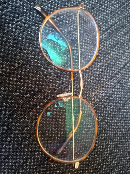 Glasögon med runda bågar i brunt och guld. Märket "WP" finns på skalmarna.