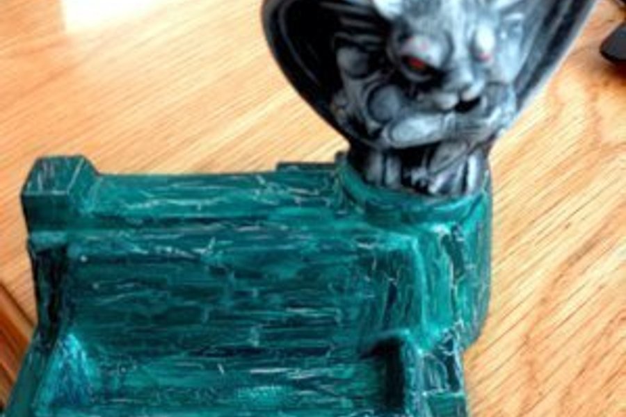 Handmålad visitkortshållare i keramik med en gargoyle. Hållaren är 14 cm hög (inkl gargoyle) och 15 cm bred.