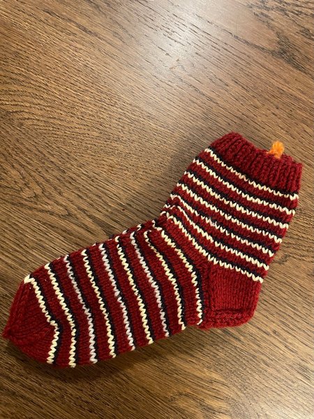 Randiga strumpor i röd, vit och blå färg. Strumporna är stickade och har en fin struktur.