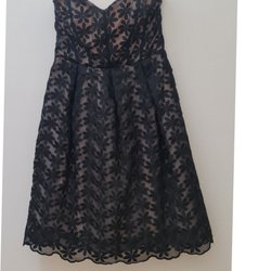 En vacker blå /Sxart spettdklänning klänning i rak stilmed v-ringning och korta ärmar. Klänningen är figursydd och har en elegant look.Baktill ett verk som gör att det inte är något problem att dansa. Längden kräver en högklack sko.Desvärre gör inte bilden rättvisa till klänningen. Den sitter mycket bättre på en kropp.
