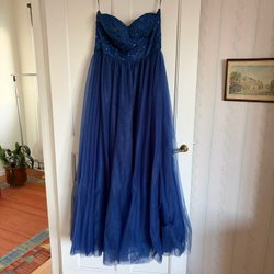 Vacker, hellång balklänning i en skimrande blå nyans. Klänningen glittrar i solljuset. Den sitter lite tajtare upp till , men passar bra för dig som är runt 170 cm lång och stl. L / xl. Klänningen är storlek 44 och av märket Lilly.