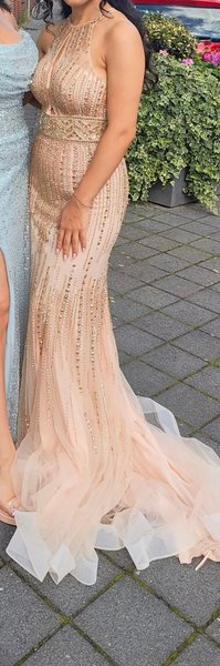 Elegant långklänning i en vacker persikofärg med intrikata guldfärgade pärlbroderier över hela klänningen. Klänningen har en halterneck-design med en nyckelhålsdetalj framtill och en figurnära passform som övergår i en utsvängd sjöjungfrukjol med flera lager tyll. Pärlbroderierna är koncentrerade runt överdelen och midjan och sprider sig sedan nedåt i ett strålande mönster. Perfekt för högtidliga tillfällen som bal eller fest.