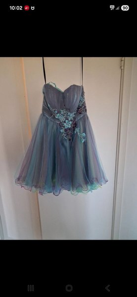 Kort klänning med en hjärtformad urringning och en figurnära överdel. Klänningen har vackra applikationer och broderier i turkos och lila nyanser på bysten och midjan. Kjoldelen består av flera lager tyll i olika färger som skapar en voluminös och lekfull silhuett.