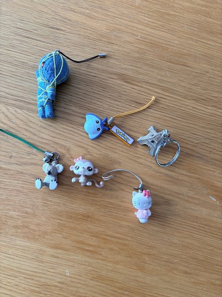 Ett set med olika berlocker. Inkluderar en blå docka, en Pokémon berlock, en Eiffeltornsberlock, en koala, en apa och en Hello Kitty berlock.