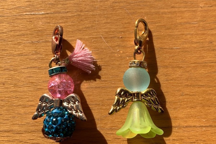 Två lyckoänglar (nr 4). En med liten rosa tofs och en med kjol. Liten karbinhake som lätt fästes på jackan, väskan eller varför inte på grimman till hästen. Egengjorda. Samfraktar.