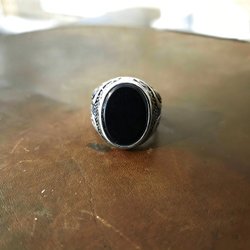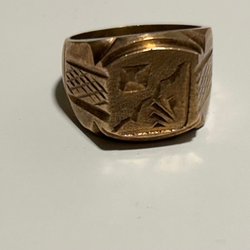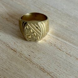 En guldfärgad ring med ett graverat mönster på ovansidan. Ringen har en klassisk design.