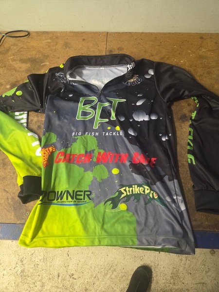 Fiske tröja med långa ärmar. Tröjan har en dragkedja vid halsen och tryck med olika fiskemärken som Strike Pro och Owner. Den har färgerna svart, grå och limegrön. Perfekt som övertröja till crosskörningen stl s.