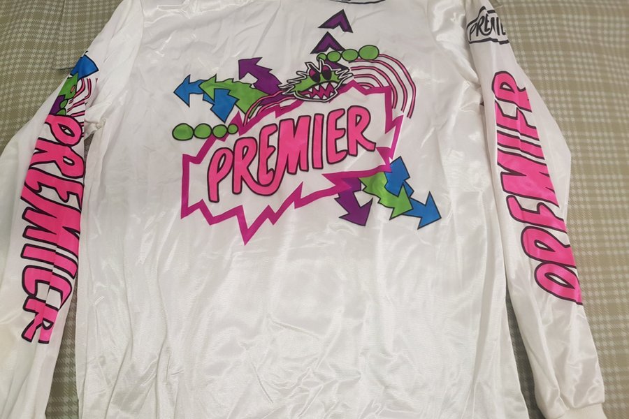 Vit tröja med långa ärmar och färgglada tryck av märket Premier. Trycket har motiv av pilar och texten "Premier".