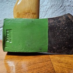 Fungerar att hugga ved med. Köpt på loppis säljer den vidare nu.