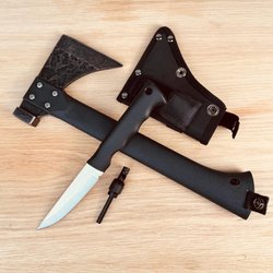 Yxa med trähandtag. Handtaget har ett mönster ingraverat. Yxhuvudet är fäst med silverfärgad tejp.