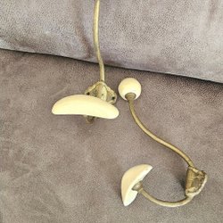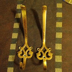 Krokar i mässing med tillhörande skruvar. Varje krok har två fästpunkter. Lämpliga för upphängning av kläder eller andra föremål.