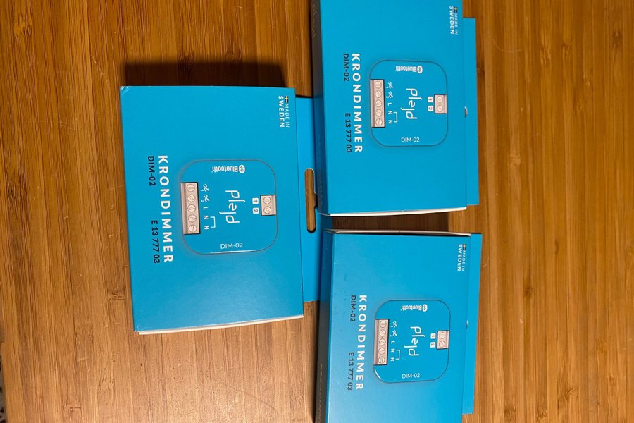 Tre Plejd Krondimmer DIM-02. Dessa dimmers är tillverkade i Sverige och har Bluetooth-funktionalitet. Modellnumret är E 13 777 03