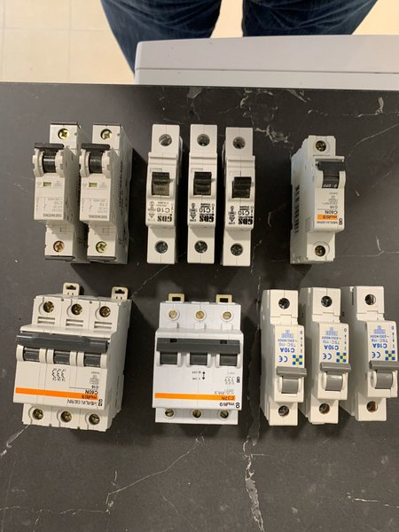 Parti med automatsäkringar från Siemens, GDS och Merlin Gerin. Modellerna inkluderar Siemens 5SY61 MCB C10, GDS C10, GDS C16, Merlin Gerin Multi 9 C60N C10, Merlin Gerin Multi 9 C60N C16, Merlin Gerin Multi 9 C32N C16, samt TSC-110 C10A och TSC-116 C16A.