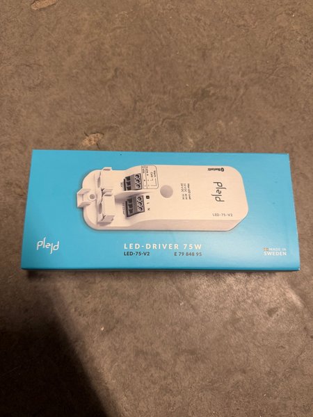 Plejd LED-DRIVER 75W, modell LED-75-V2. Denna LED-driver är tillverkad i Sverige och har Bluetooth-funktionalitet. Den stöder en maximal LED-belastning på 40W vid 12VDC och 75W vid 24VDC. Anslutningskapaciteten är 0.5-2.5 mm² för SELV-anslutningar och den har både 2- och 3-trådsanslutningar för varm och kall.
