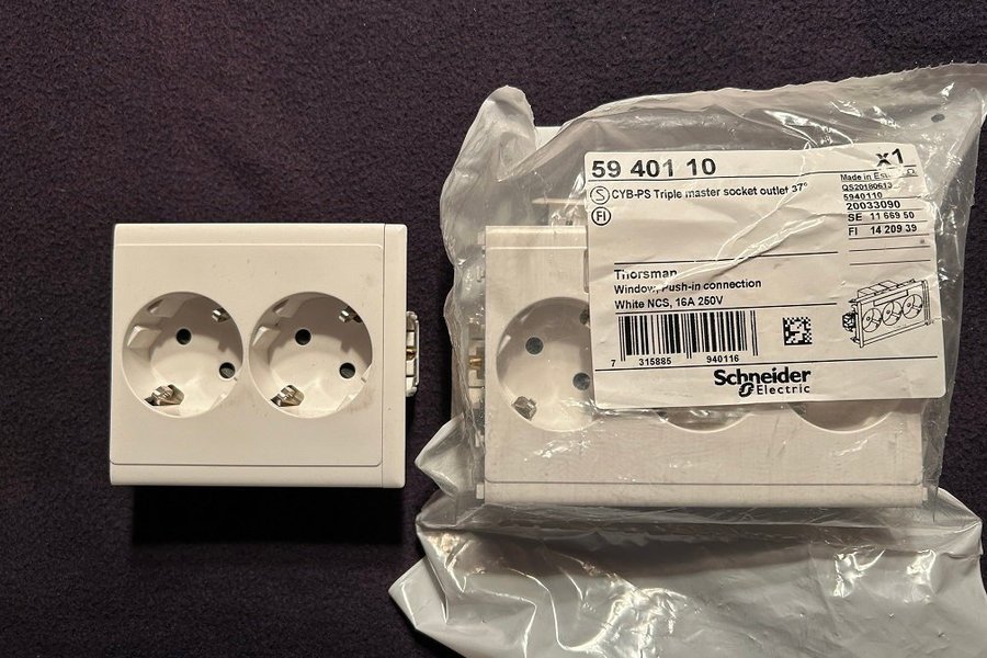 Schneider Electric Torsman vägguttag. 59 401 10, CYB-PS Triple master socket outlet 37°. Window, push-in connection, White NCS, 16A 250V.